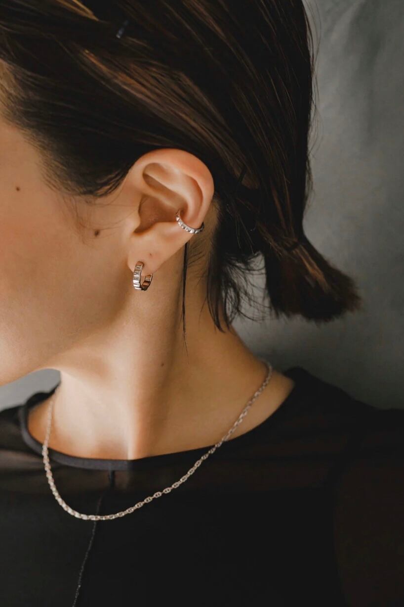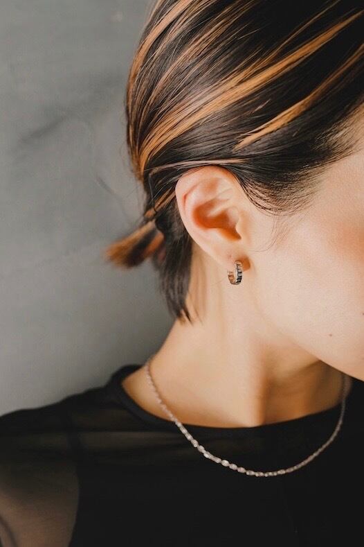 ピアス素材:Silver925(ゴールドはSilver925素材に18Kメッキが施されています) 立体感のあるタイルを並べたようなデザインがとても可愛いフープピアスです! ピアスバックが不要で大きすぎず小さすぎない絶妙なサイズ感が使いやすく、シンプルながらコーディネートのアクセントとして活躍してくれると思います◎