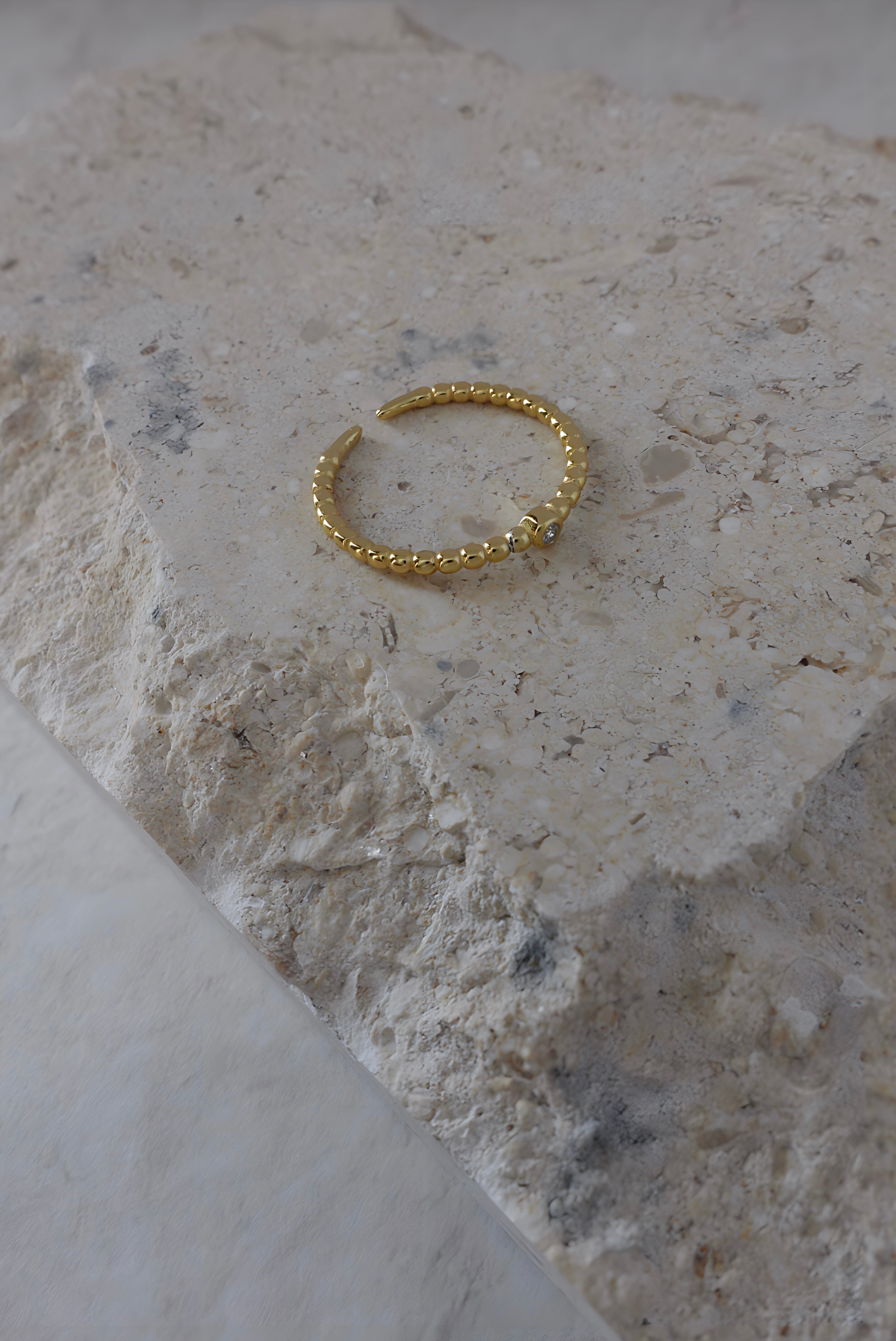 シルバーリング素材:Silver925(Silver925素材に18Kメッキが施されています) ストーン素材:ジルコン シルバーリング径:16.0mm(約10号) シルバーリングサイズ:オープンサイズ/調節可能 細めのゴールドの土台に小さめのストーンの組み合わせがとても可愛いリングです! 中指や人差し指につけても華奢見えし、上品な印象を与えます◎