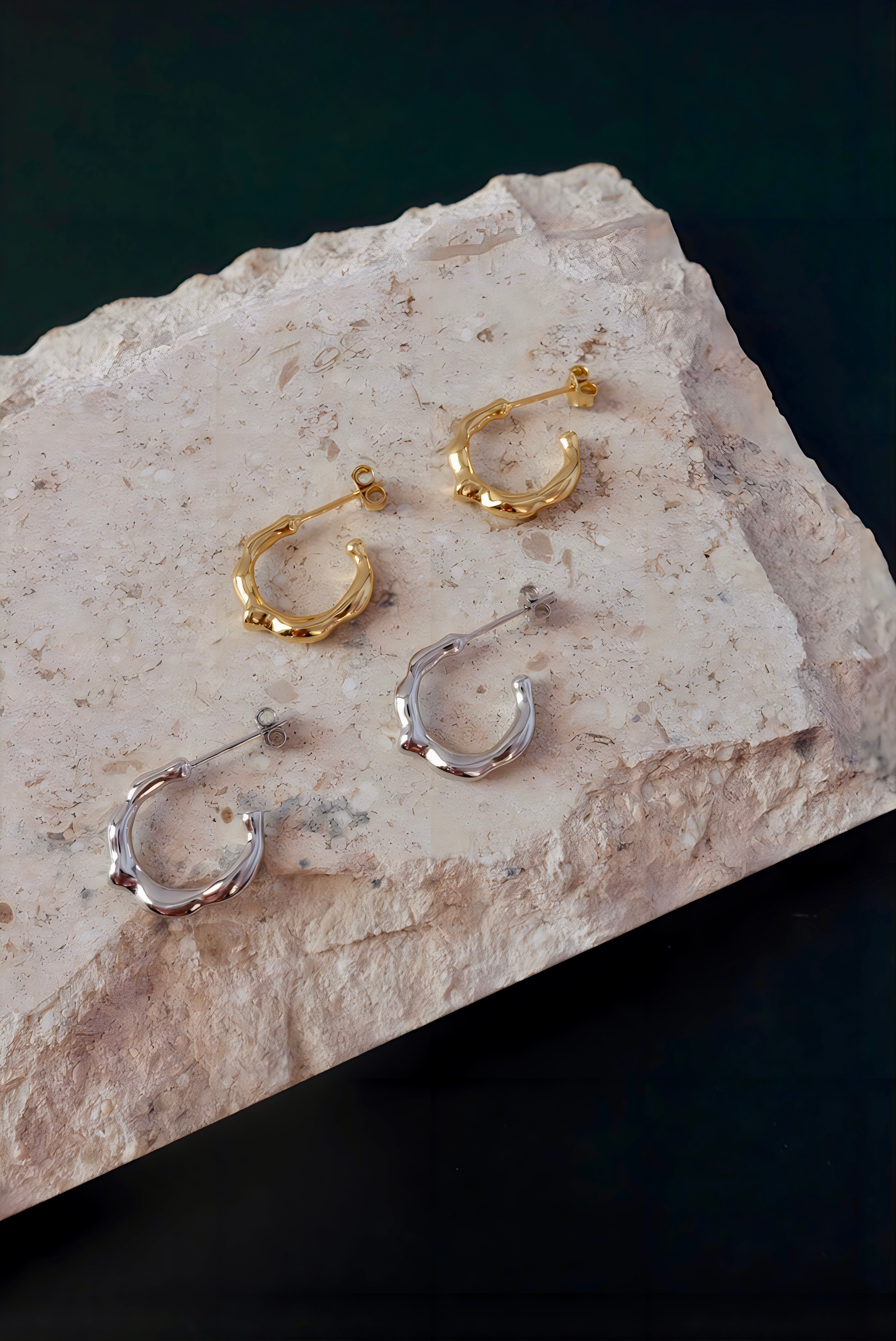 シルバーピアス素材:Silver925(ゴールドはSilver925素材に18Kメッキが施されています) 肉厚で小さめのフープがとても可愛く人気のピアスです! しっかりとした作りが高見えし、なめらかでぷっくりとしたフォルムとツヤがさりげなく顔周りを明るく見せてくれ、どんなコーディネートにも取り入れていただけます◎