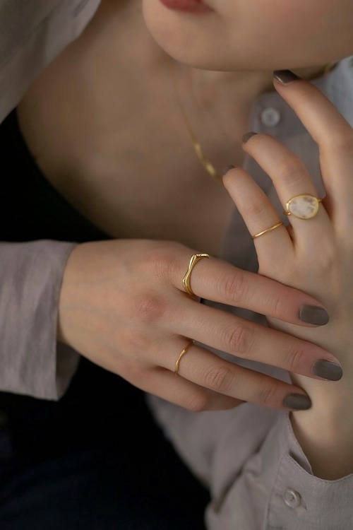 シルバーリング素材:Silver925(ゴールドはSilver925素材に18Kメッキが施されています) シルバーリング直径:16.7mm(約12号) シルバーリングサイズ:オープンサイズ/調節可能 正面から見てもはっきりわかる流体デザインがとてもお洒落なリングです! 単体ではもちろん細めのリングなどと合わせても可愛く、一つあると手元のコーディネートの幅が広がります◎