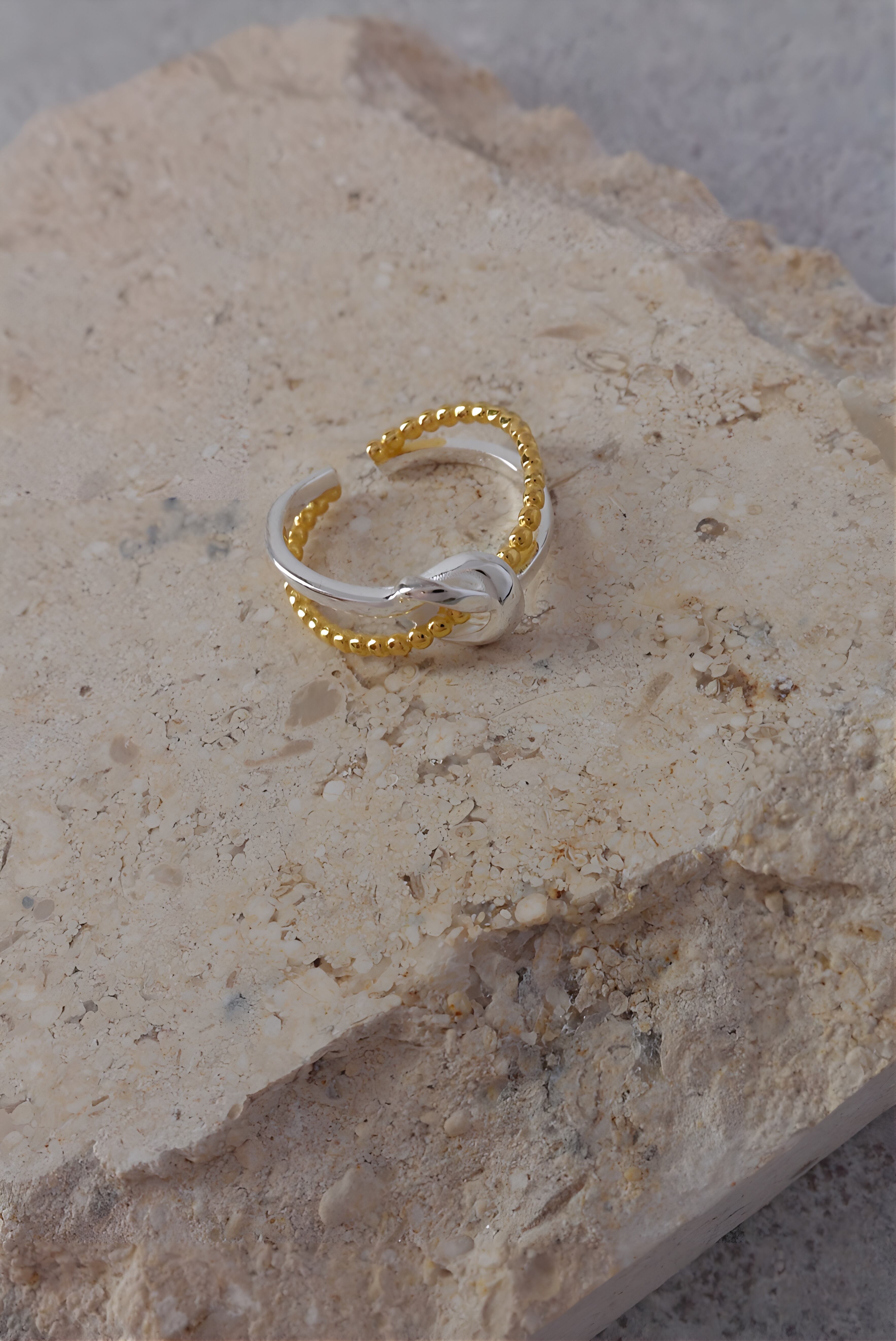 シルバーリング素材:Silver925(ゴールド部分はSilver925素材に18Kメッキが施されています) シルバーリング直径:16.7mm(約12号) シルバーリングサイズ:オープンサイズ/調節可能 人気のバイカラーと結び目を掛け合わせたデザインがとてもお洒落なリングです! ゴールド部分が細かいボールチェーン状になっていることで肌によく馴染んで手指がほっそり見え、華奢なリングを合わせたりしても可愛いです◎