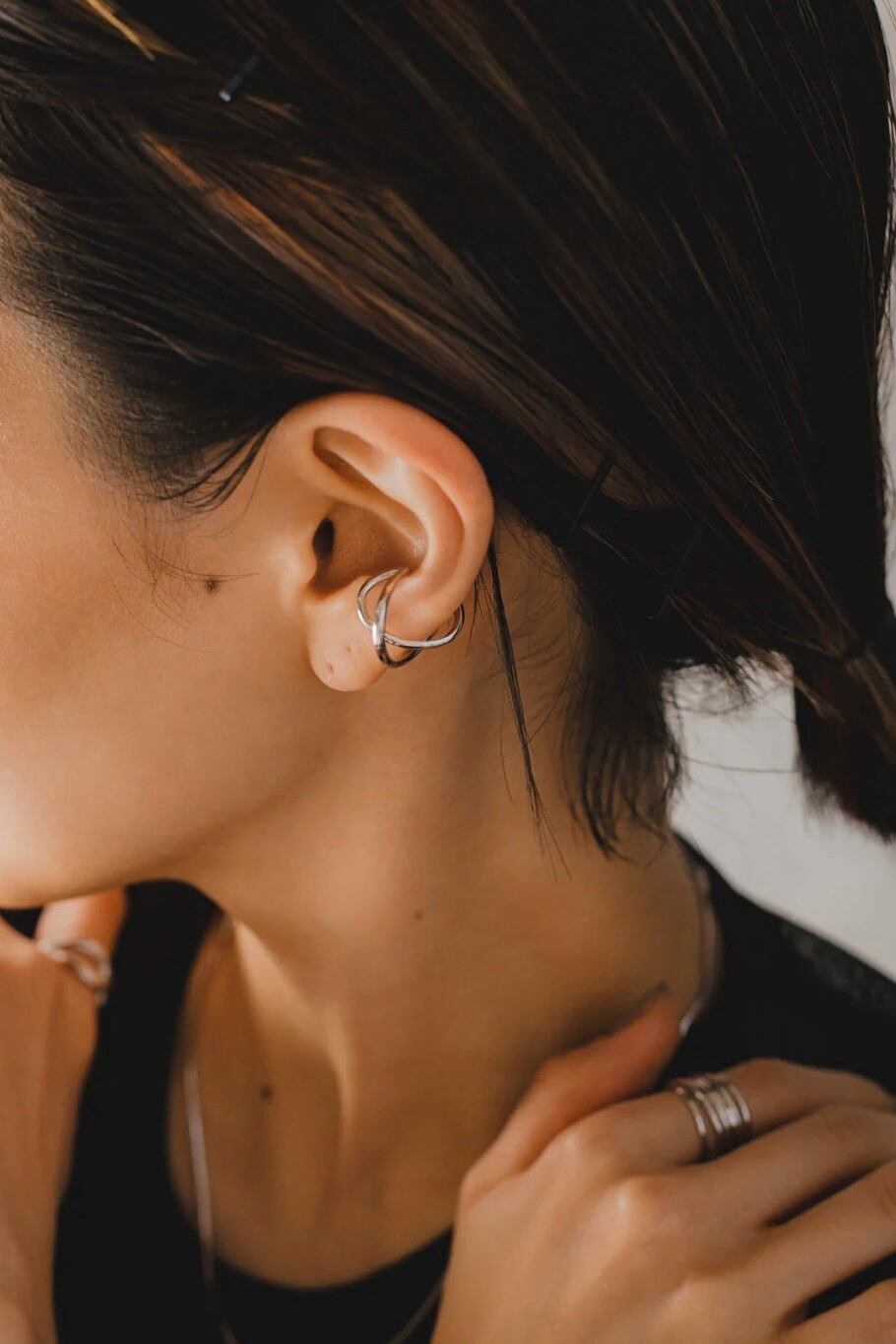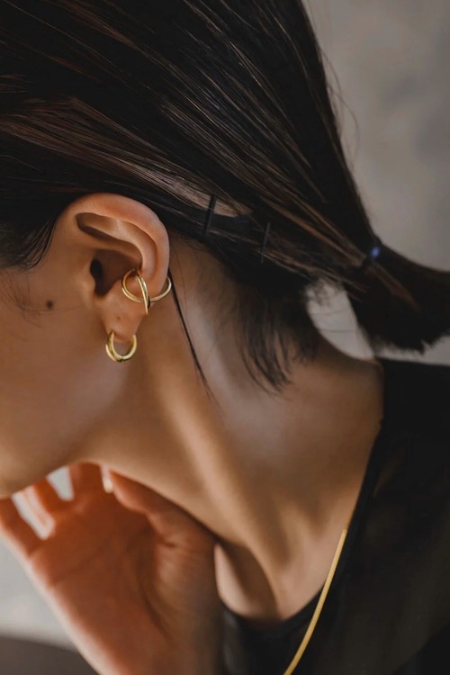 シルバーイヤーカフ素材:Silver925(ゴールドは18Kメッキが施されています) 抜け感と立体感を兼ね備えた絶妙なバランスのクロスデザインがとてもお洒落なイヤーカフです! 単体ではもちろんピアスとの相性も抜群で、初めてのイヤーカフとしてもおすすめです◎