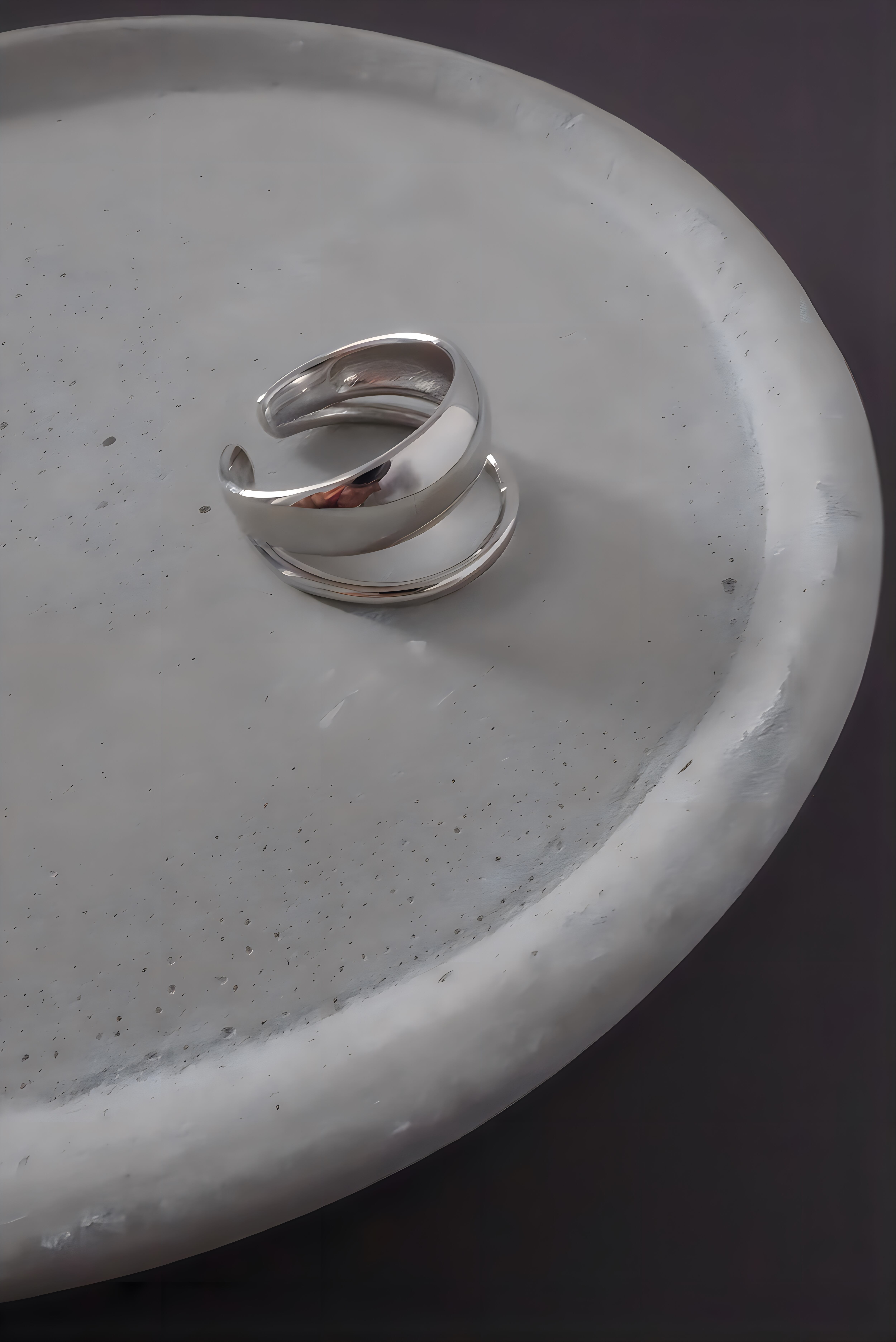 シルバーリング素材:Silver925 シルバーリング内径:16.4mm(約11号) シルバーリングサイズ:オープンサイズ/調節可能 艶やかでボルューミーなダブルデザインがとてもお洒落なリングになリます!! 立体的ですっきりとしたフォルムが手指が美しく見せてくれ、一つつけるだけで手元のコーディネートが完成します◎