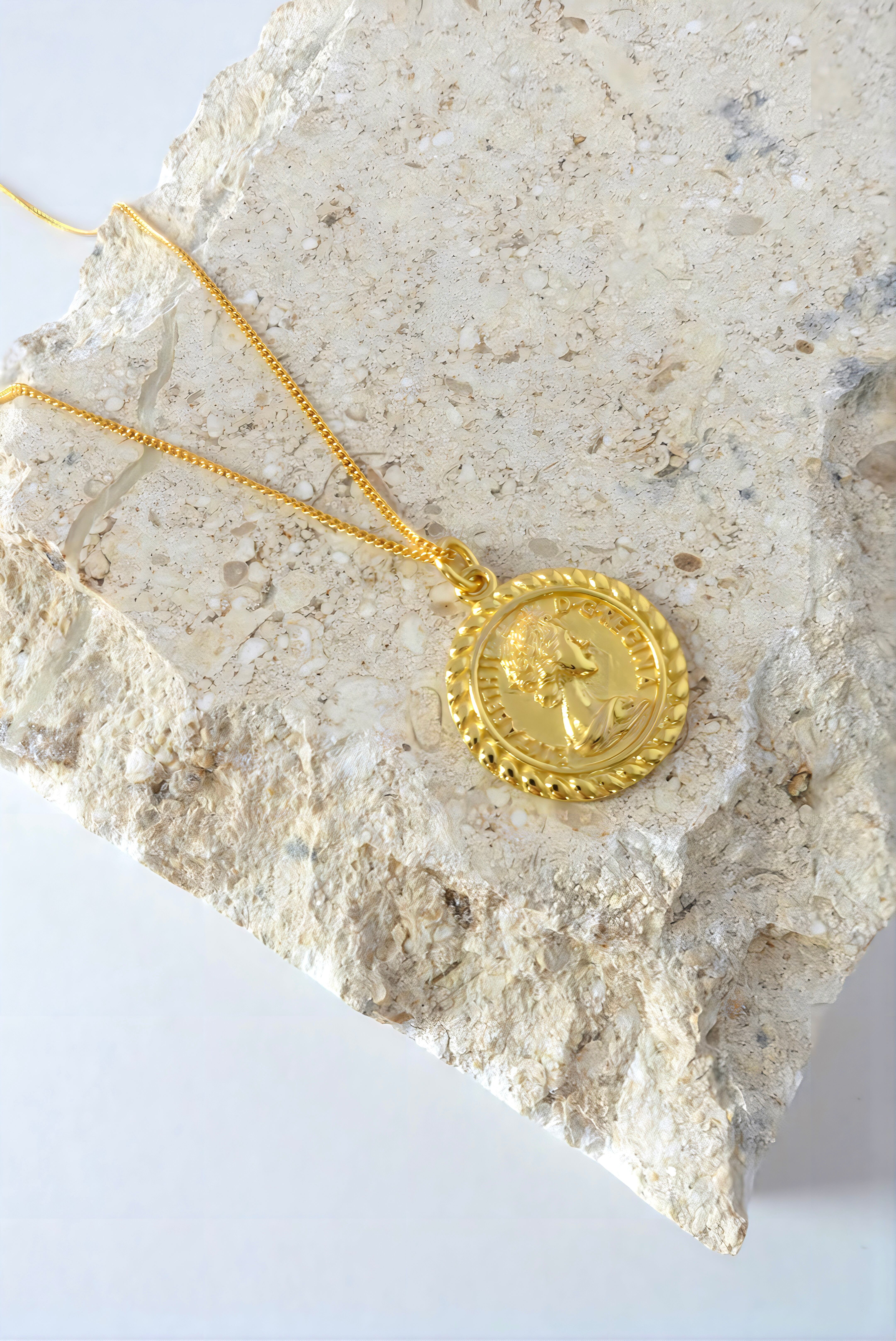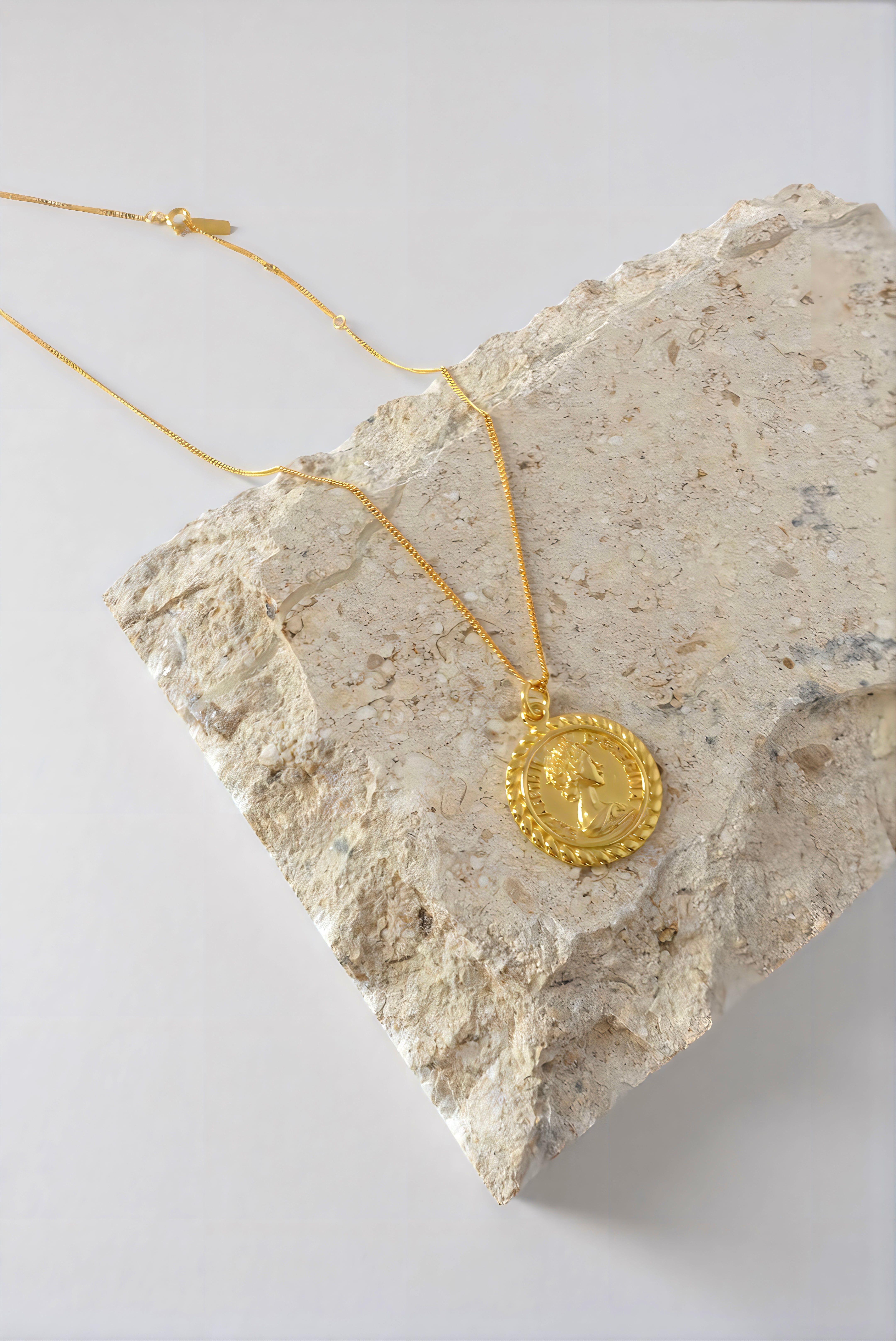 素材:Silver925(Silver925素材の上から18Kメッキが施されています) チェーンの長さ:39.5cm+調節用チェーン4.5cm(2段階で調節可能) 存在感のあるゴールドのコインモチーフが目を惹くネックレスです!! 縁のデザインと少しオレンジがかったお色味がコーディネートに取り入れやすく、単体ではもちろん他のネックレスと重ねづけしても可愛いです◎
