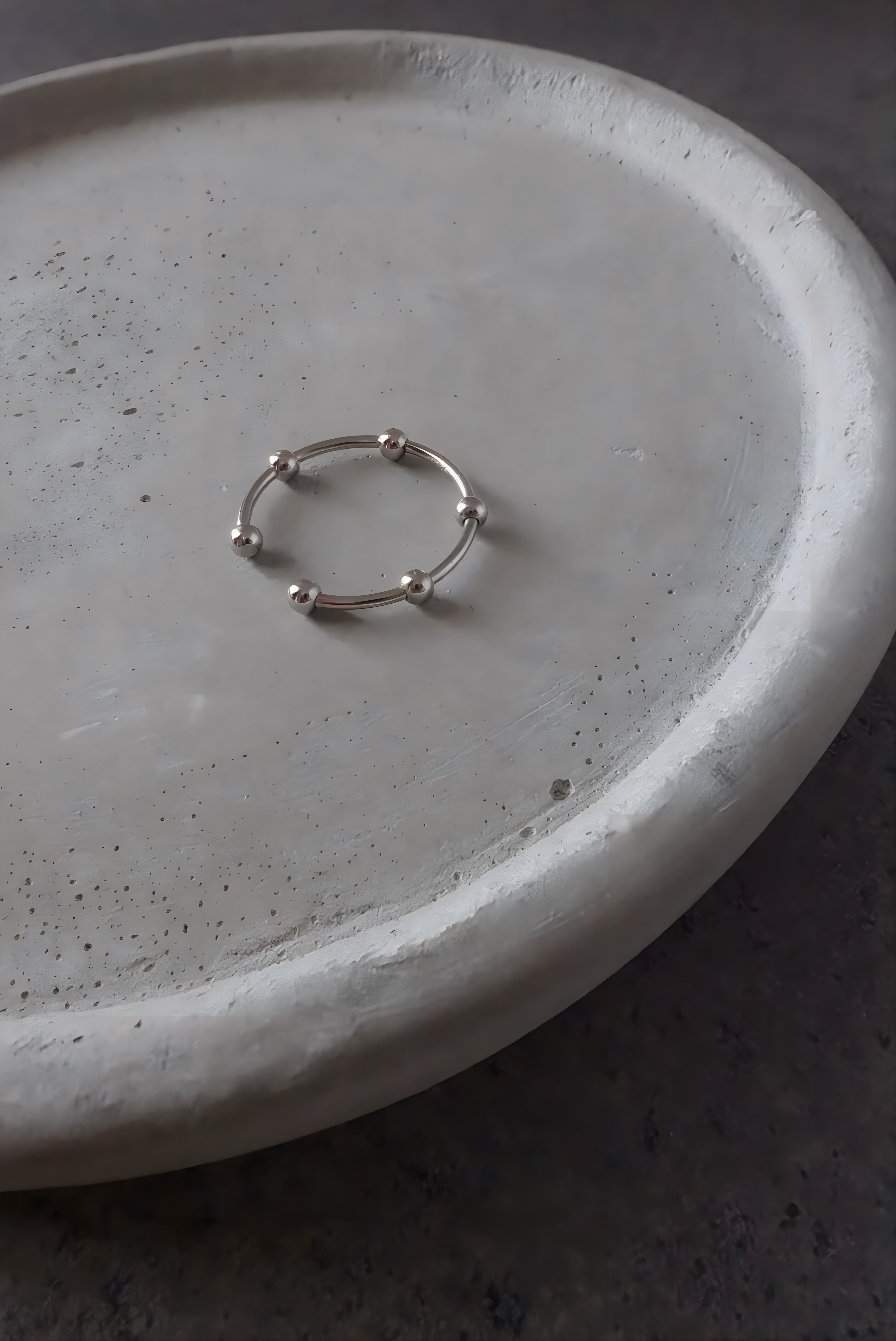 シルバーリング素材:Silver925 シルバーリング内径:14.3mm(約5号) シルバーリングサイズ:オープンサイズ/調節可能 細めのリングに球体を掛け合わせたシンプルなデザインがとてもお洒落なリングです! ピンキーリングにしても可愛く、単体ではもちろん他のリングと重ねるなど一つあると沢山手元のコーディネートにお使いいただけると思います◎