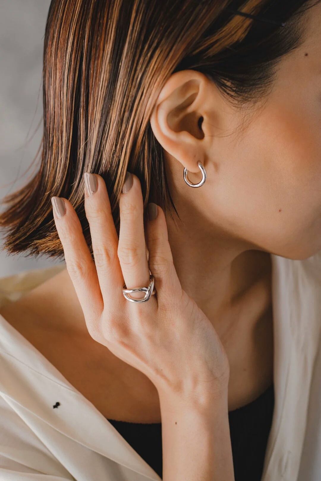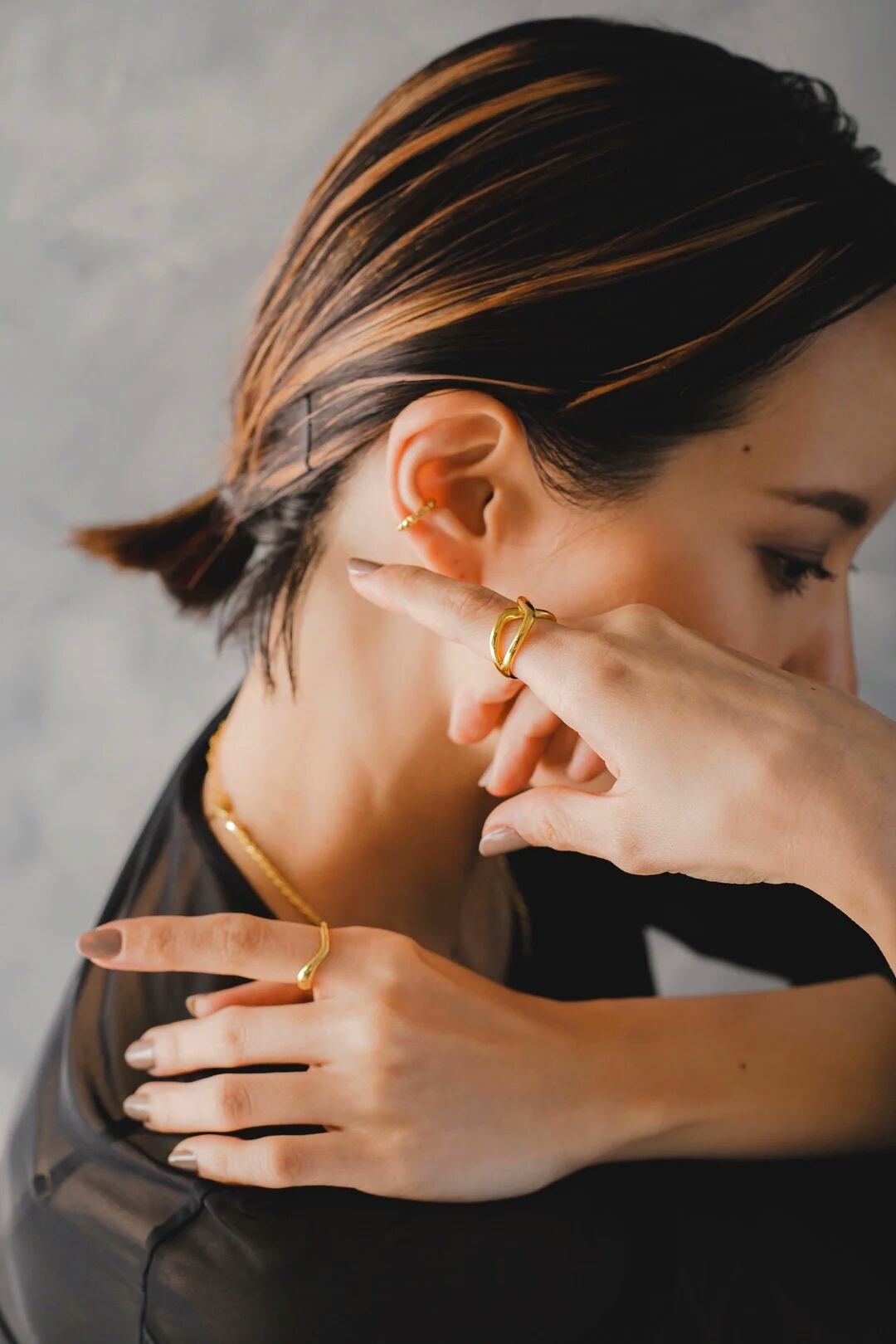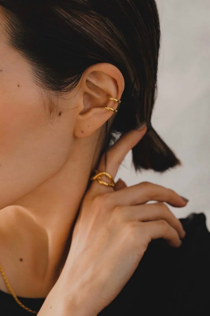 シルバーリング素材:Silver925(ゴールドはSilver925素材に18Kメッキが施されています) シルバーリング直径:16.7mm(約12号) シルバーリングサイズ:オープンサイズ/調節可能 艶やかでしっかりめのボリュームながらすっきりとしたフォルムが手指に馴染むリングです! 単体ではもちろん、写真のように曲線の感じやボリュームの近いアクセサリーと合わせるととても可愛いので是非◎