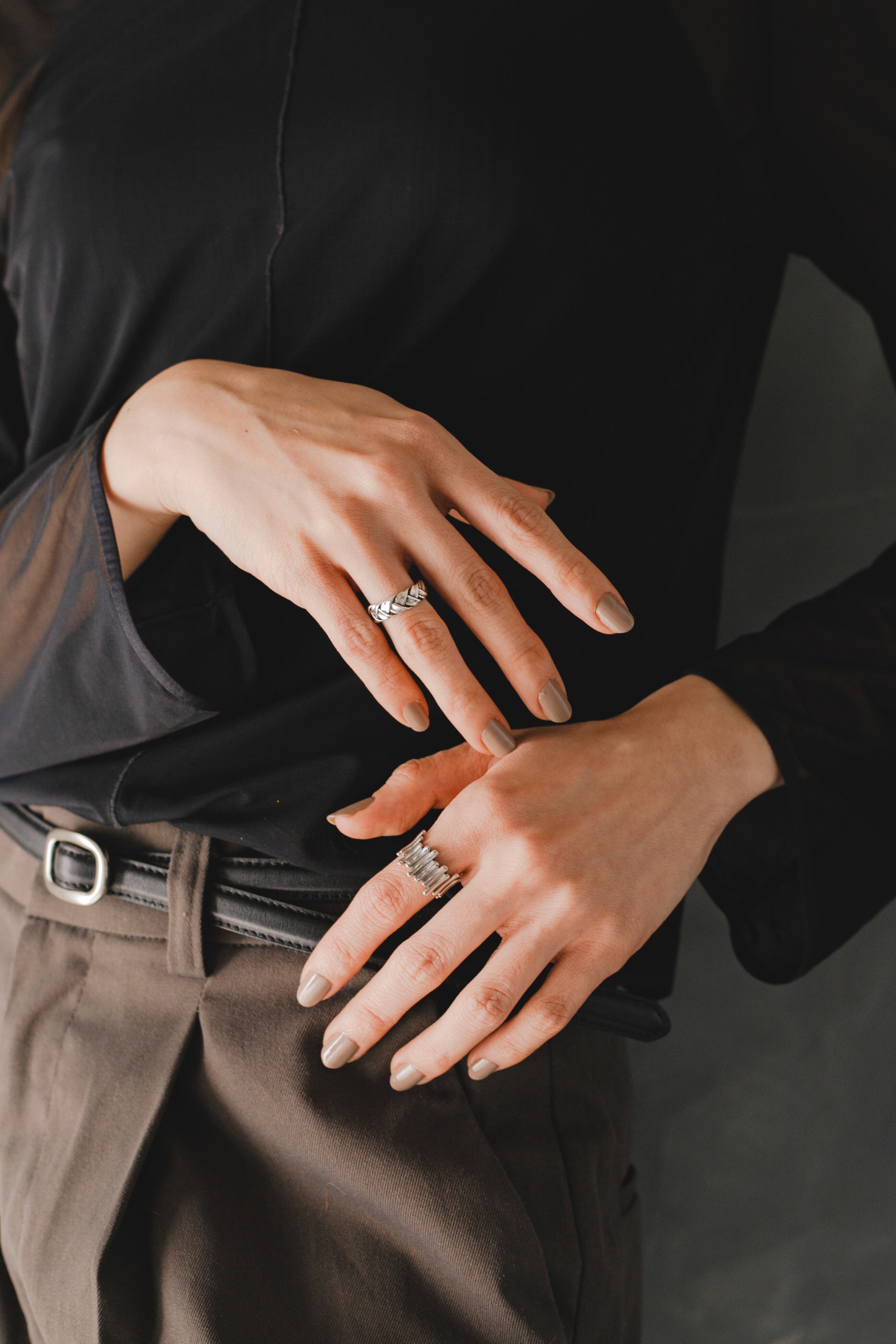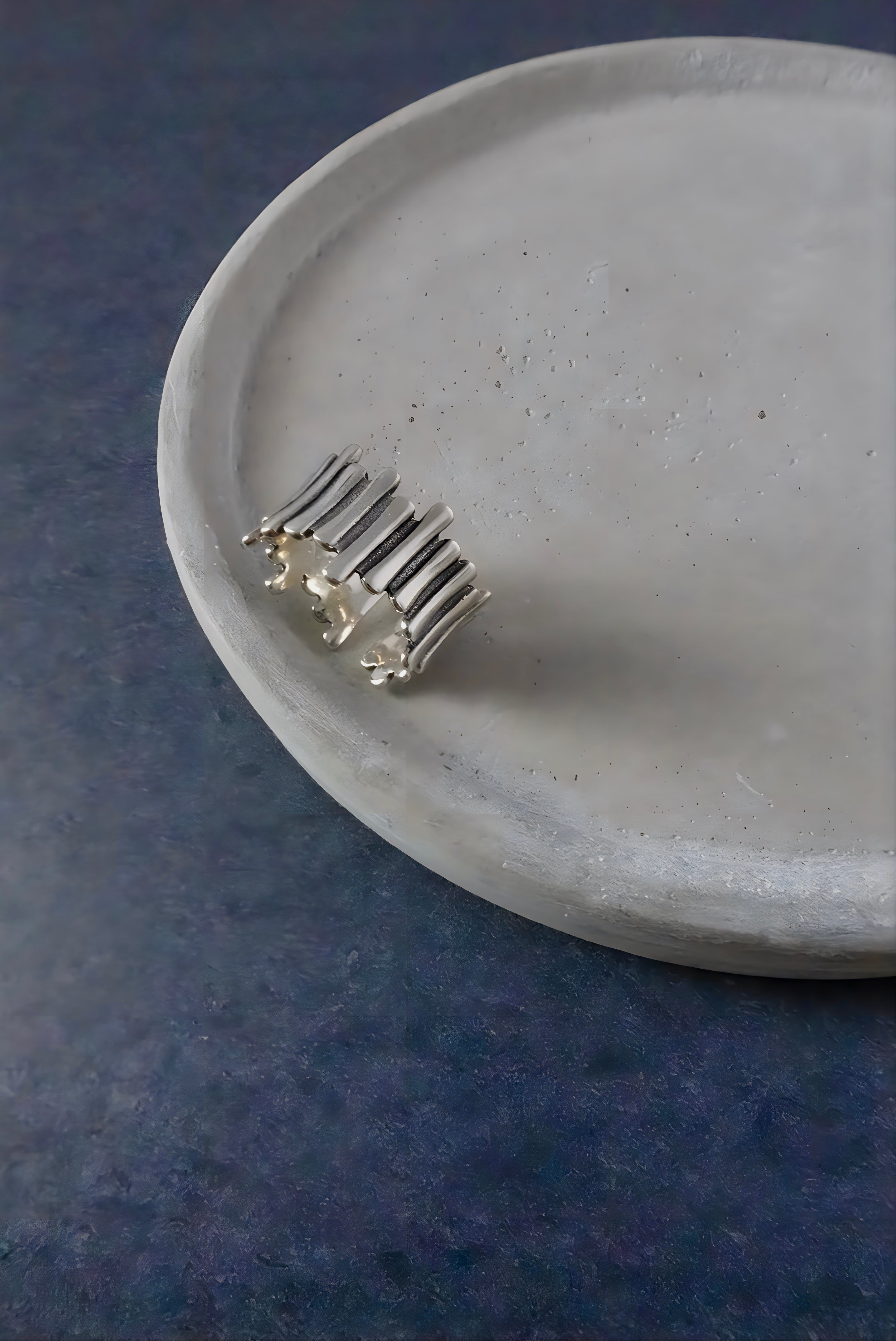 シルバーリング素材:Silver925 シルバーリング直径:約16.4mm(約11号) シルバーリングサイズ:オープンサイズ/調節可能(最小約8号) 人気のヴィンテージ加工で手指になじむ縦のラインと曲線がお洒落なリングです! クールになり過ぎないで絶妙なバランスで、一つつけるだで手元のコーディネートが完成します◎